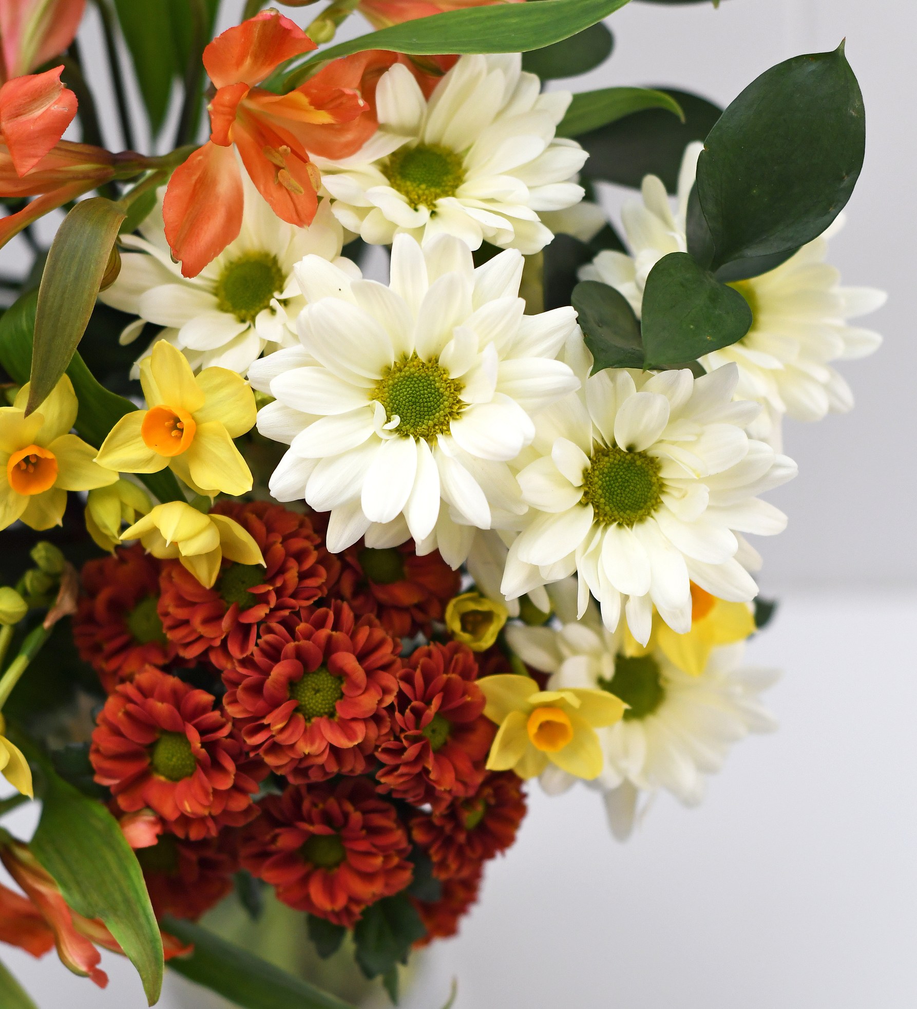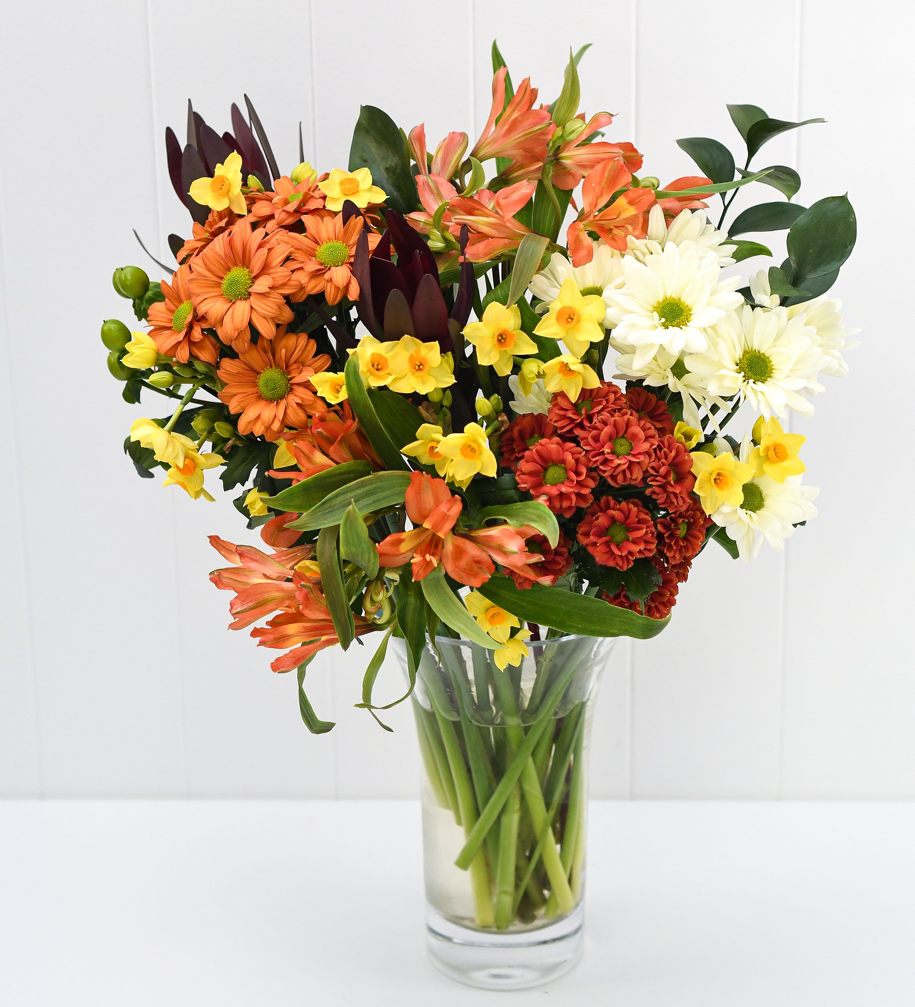 Our farm florist has designed a beautiful seasonal posy bouquet combining island grown scented narcissi with chrysanthemums and alstroemeria in warm autumnal tones, striking leucadendron and green berries all backed with ruscus foliage.